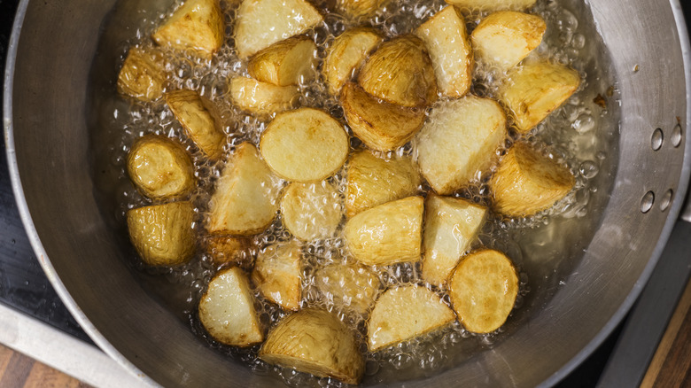 As we've noted before, the perfect potatoes are crispy — and wasting their starchy qualities is nothing short of a travesty. Even if you don't have a deep fryer in your kitchen, you can still enjoy pan-fried potatoes with your skillet. Fry garlic herb skillet potatoes and watch your spuds transform into something fantastic. Plus, you won't have to boil the potatoes before cooking, which significantly cuts down on prep time.