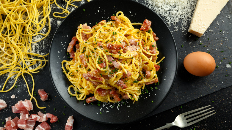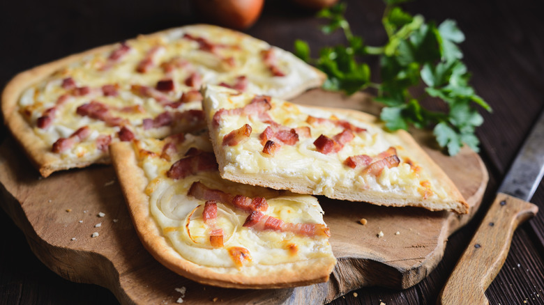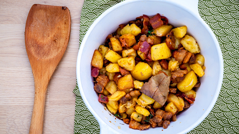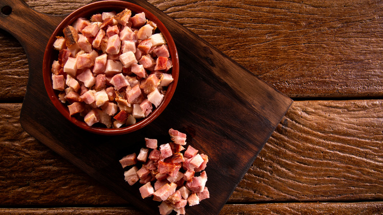 The beauty of lardons is their versatility. When topping hot dishes like Tartiflette (a cheesy French potato dish you should definitely try) with lardons, make sure to garnish at the end of the cooking process so that they remain crisp. Because of their high-fat content, you want to prevent your dishes from becoming greasy, so remember to remove the lardons from the fat before combining them with the rest of the meal. However, this doesn't mean you should waste the fat. In fact, it means just the opposite — any fat rendered during the cooking process will work as a delicious substitute for oil or butter in another dish, so don't forget to save it.