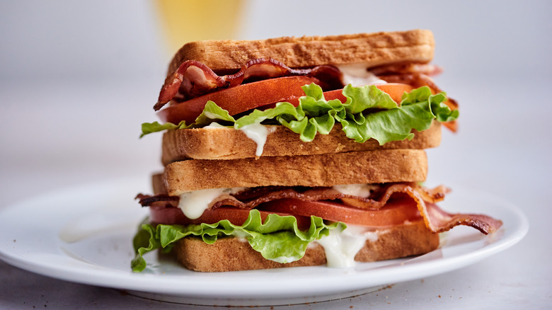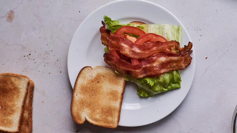 Use thick-cut bacon for this recipe to get the crispiest results; thin bacon might burn before the honey can fully caramelize. When preparing your bacon, brush the hot honey directly onto each slice. If you don't have a brush handy, spoon it onto the bacon or spread it with your fingers or a knife. For best results, McGlinn recommends baking the coated bacon at 400 degrees Fahrenheit for 15 to 20 minutes — or until it's the crispness you like. Then, layer the warm bacon onto your BLT and take a blissful bite of this crispy, sweet twist on an American classic.