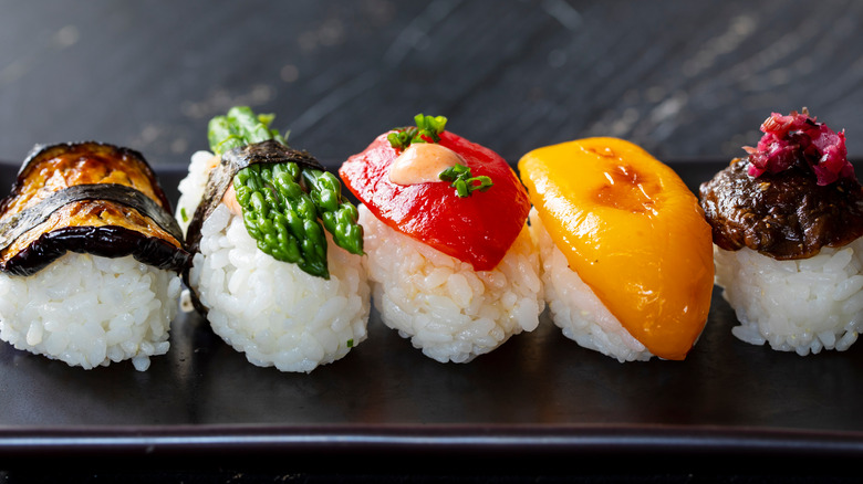 There are traditional types of sushi rolls that don't contain any raw fish: Kappa (cucumber), shinko (pickled radish), and kampyo (made with dried gourd) nigiri are inherently vegetarian. "I love vegetable sushi. If you go back to my grandma's cooking ... it was all [made with] vegetables because we couldn't afford to buy fish." Sato's philosophy on eating sustainability remains simple: Reduce protein consumption and eat more vegetables. "Don't do fake tuna, fake this, fake that. ... What's the point?"