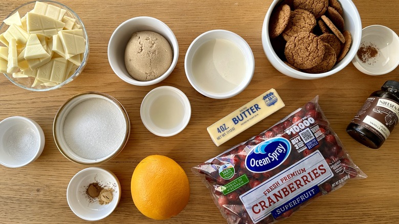 This tart recipe has multiple components: the crust, the jam, the ganache, and the toppings. For the crust, you'll need just two things: gingersnap cookies and unsalted butter. The jam calls for cranberries, ground cinnamon and ginger, orange zest, lemon juice, light brown sugar, and either water or bourbon. White chocolate (chips or chunks), salt, heavy cream, softened butter, nutmeg, and vanilla paste or extract make up the ganache.