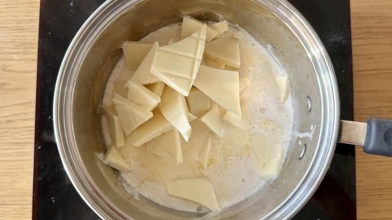 - Add the white chocolate and let sit 1 to 2 minutes.