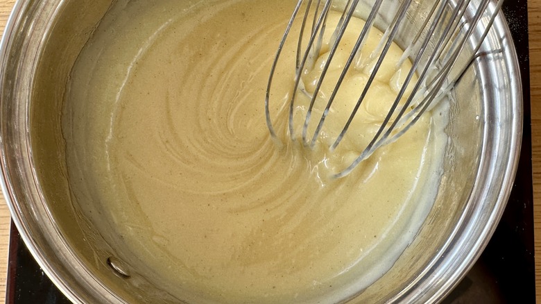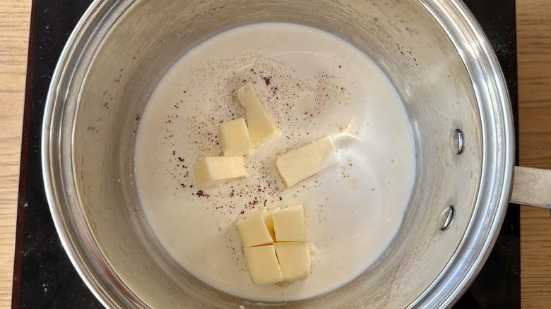 - In a small pot, bring cream, 4 tablespoons of butter, vanilla, nutmeg, and salt to a simmer.