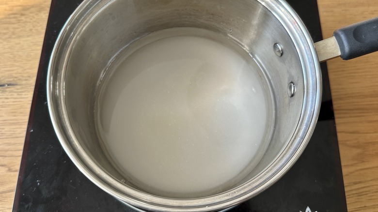 - In a small pot, bring ½ cup sugar and ½ cup water to a simmer.