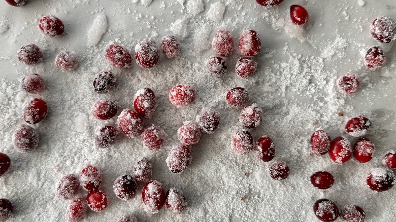 - Sprinkle the cranberries with the remaining ¼ cup sugar, and shake the baking sheet back and forth to coat them.