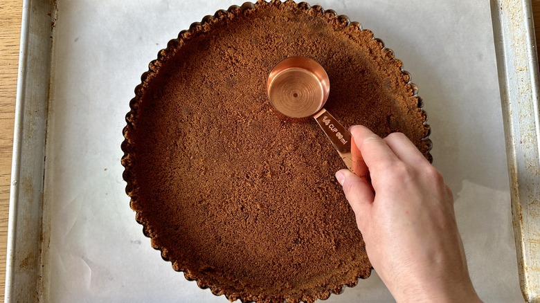 Use a small measuring cup to press gingersnap mixture evenly into a 9-inch fluted tart pan set over a prepared baking sheet.