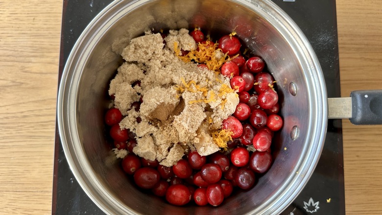 - In a small pot, heat cranberries, orange zest, brown sugar, cinnamon, ginger, lemon juice, and water or bourbon over medium heat until cranberries break down, stirring often, 4-6 minutes. Optional: blend until smooth.