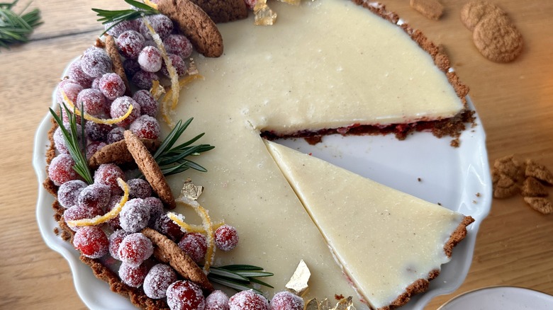 "Fresh or frozen cranberries can be used for the cranberry jam," Rosenhouse notes. "You can substitute with canned whole-berry cranberry sauce, just adjust the additional flavorings as needed if the sauce is heavily sweetened." If you don't want to use alcohol, you can skip the bourbon. "Bourbon lends great flavor to the tart that pairs well with the white chocolate and gingersnap crust. But if you don't love the flavor of bourbon, or are serving the whole family, water does the trick for adjusting the consistency of the cranberry sauce," she adds. And finally, for the elegant, picturesque garnish, you'll need more cranberries and sugar, and if you want to add some extra flair, get some edible gold leaf, pieces of ginger cookie, rosemary sprigs, and candied orange peel.