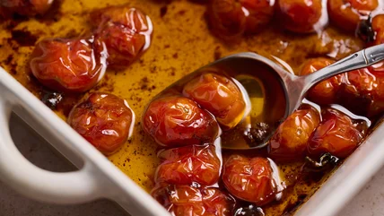 Confit is not limited to meats, though, and can be used to preserve vegetables as well, creating a less acidic product than would result from the pickling process. In the case of garlic or tomatoes, confit tames the bite of strong raw garlic or raw tomato flavor, creating instead a jammy, buttery topping that has a wide variety of applications. It can be spread on toast, mixed with pasta, layered in a sandwich, or eaten by the spoonful straight from the jar. In this recipe written with developer Michelle McGlinn, cherry tomatoes are slowly roasted in a barely warm oven until soft and bursting. Combined with oil, sugar, and Aleppo pepper, the tomatoes caramelize into a sweet but spicy topping that is perfect for easy breakfasts and delicious dinners.
