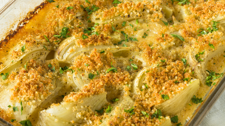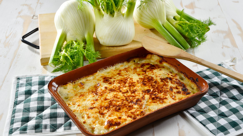 Most recipes use white potatoes for gratins, and when you think about it, the potatoes don't add much flavor — the creamy dairy sauce they're baked in is the real star of the show. Potatoes provide that satisfyingly starchy texture, but if you overbake a potato gratin, you'll wind up with a disappointing mash. Fennel keeps its texture much better and contributes a sophisticated flavor profile that makes the gratin a memorable side dish.
