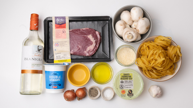 Gather the ingredients for this creamy garlicky steak fettuccine recipe