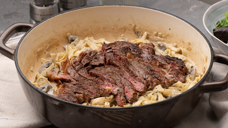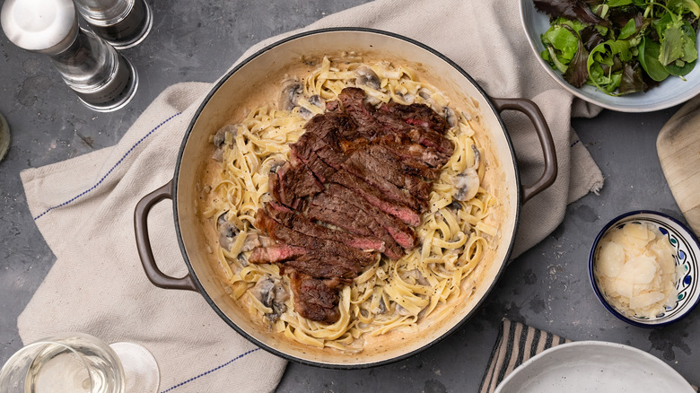 If you are looking for the ultimate comforting and decadent pasta dish, this creamy garlicky steak fettuccine from the kitchen of Tasting Table Recipe developer Jennine Rye is sure to hit the spot. This easy-to-follow recipe combines tender ribeye steak, sauteed shallots and mushrooms, and a creamy white wine and Parmesan sauce to create a melt-in-your-mouth meal.