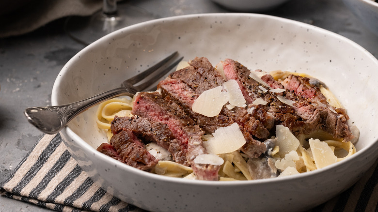 With tender ribeye steak, sauteed mushrooms, and a creamy white wine and Parmesan sauce, this pasta recipe is easy yet comforting and decadent.