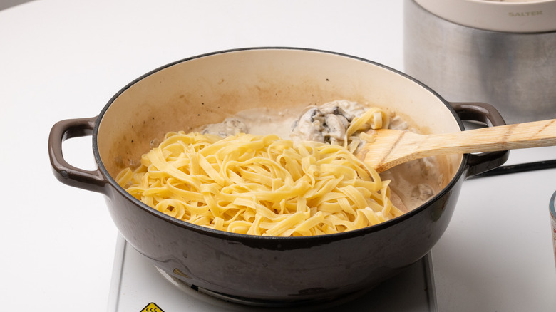 Stir fettuccine into the pan of cream sauce, adding pasta water as needed to loosen the sauce and coat the pasta.