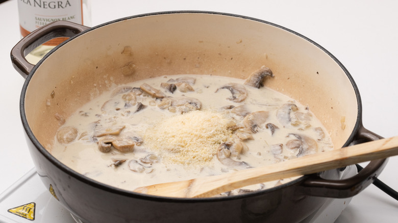 - Reduce heat to medium-low and pour in the heavy cream, lemon juice, and grated Parmesan.