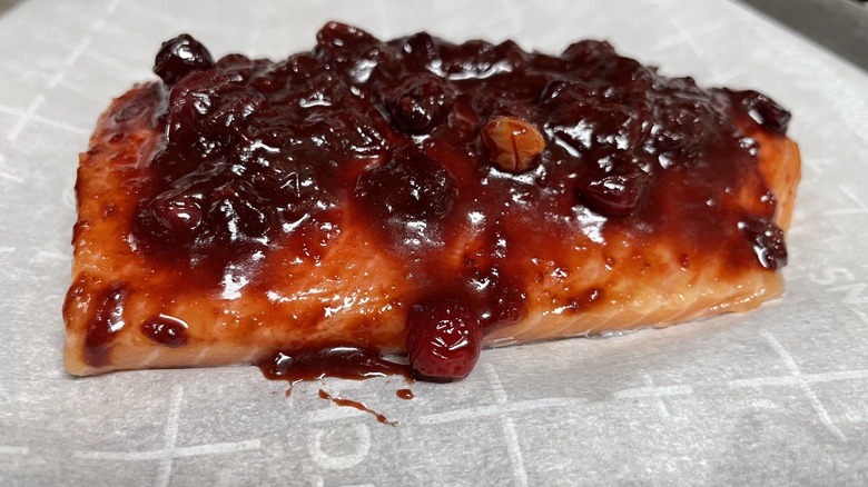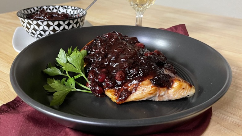 Salmon is a dinnertime go-to for many people, boasting a mild taste that leans more rich and savory than fishy — not to mention loads of vitamins and healthy fats that certainly don't hurt its reputation. Grilled, baked, or even air-fried salmon is perfectly delicious on its own, with seasoning as simple as salt and pepper getting the job done. However, it's always a good idea to get creative in the kitchen, and this glazed salmon with a sweet-tart cranberry compote recipe offers the ideal way to do so. As recipe developer Kara Barrett says, "It's a beautiful and simple dish with a really lovely presentation," offering more complex flavors that plain old grilled salmon.