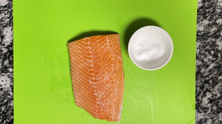 - Pat salmon dry and sprinkle with ½ teaspoon salt.