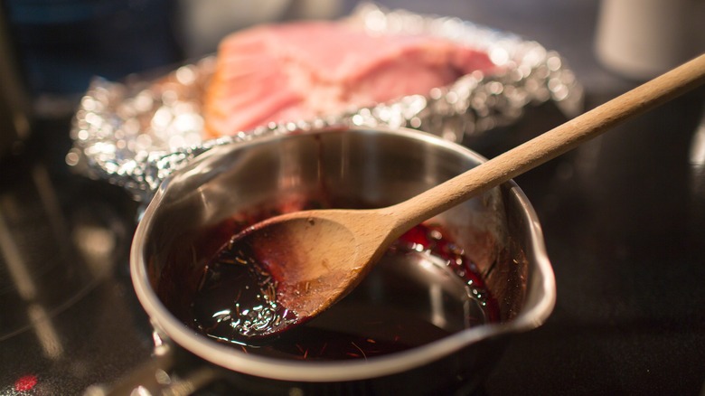 There's ham and then there's glazed ham, both tasty and both starring on countless holiday tables throughout the seasons. Each preparation method has its own merit, from baked to boiled, smoked, grilled, fried, or air fried –– but when you really crave deeply complex flavor with a sticky, crispy exterior, it's all about the glaze. It's the stuff of culinary legend, with secret glaze recipes handed down through generations. But honestly, it doesn't have to be so mysterious and complicated, especially if you embrace the concept of boozy ham with a bourbon-packed glaze.