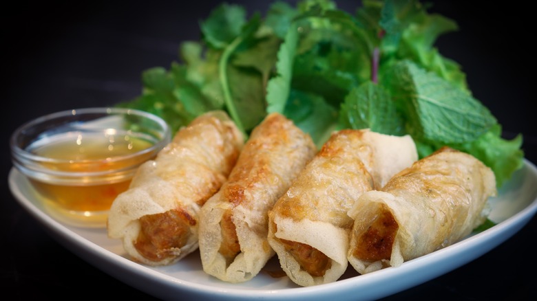 Though sweet potatoes may be a vegetable more often used to make garlicky mash or casserole, folding the brightly colored spud into rice paper can yield a satisfying side dish that delivers both texture and taste. The contrast of the light, crisp, and crunchy fried rice paper enveloping the warm, gooey, and slightly sweet filling makes for a dish that might soon replace your go-to sweet potato French fries recipe. Seasoned with cinnamon and brown sugar or rosemary and herbs, you won't soon grow tired of the possibilities this ingredient combo offers.