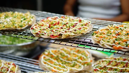 Vietnamese pizza, also known as bánh tráng nướng, is a popular street food originating in Dalat. Now, you'll find Vietnamese pizza stalls and brick-and-mortar eateries in Ho Chi Minh City and Hanoi as well. Especially popular as an afterschool snack or cheap meal for students, Vietnamese pizza uses rice paper as a light and crunchy foundation to top with a freshly beaten quail egg that serves as a tasty binder for your choice of numerous toppings and condiments. It's made to order, completely customizable, and comes together over a griddle or coal-fired grill in a matter of minutes.