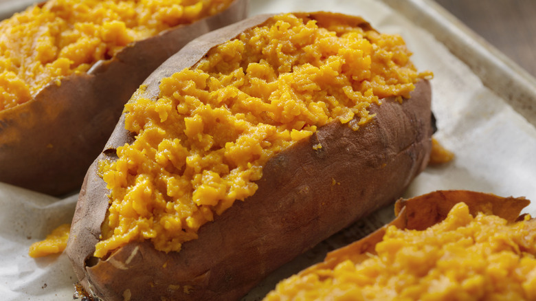 Sweet potatoes can take on so many different forms, but we're especially fond of eating them baked and loaded with goodies. Much like a loaded baked potato, sweet potatoes can be the foundation of a simple and hearty meal. While you can use similar ingredients to top the sweet spud, it pairs well with earthy and nutty flavors, such as those in almond butter. As the sweet potato bakes, its sweetness is amplified, offering a delightful contrast with caramelized notes.