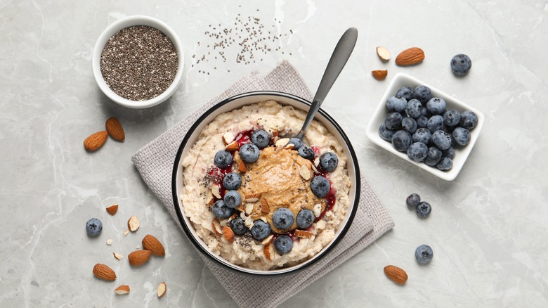 Meanwhile, if you want a chilled morning meal, combine mashed banana, almond milk, chia seeds, Greek yogurt, oats, and strawberries in a container and refrigerate the mixture overnight. When you're ready to dig in, add a dollop of almond butter and extra fruit to garnish.
