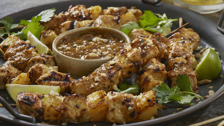Much like peanut sauce pairs well with foods like dumplings and noodles, almond sauce can be just as delicious. You might want to try this alternative due to allergies or a preference for almonds, but either way, you'll love the result. Almond butter offers a slightly milder flavor profile that pairs well with similar ingredients. Try a simple grilled chicken satay recipe, swapping the standard peanut side sauce for an almond butter base. Add chili, fish sauce, maple syrup, soy sauce, garlic, ginger, and lime juice for a zesty sauce to enhance the grilled chicken.