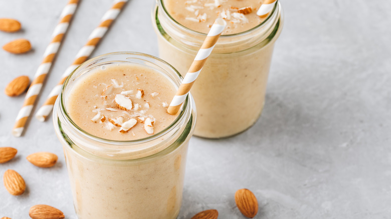 If you're used to adding peanut butter to your smoothie, swap in almond butter for a delicious and nutritious option. It pairs well with fruity, green, and dessert smoothies, so it's all about adding the ingredients you love. A ginger cinnamon pear smoothie recipe adds zing and a spiced flavor profile, with loads of creaminess thanks to the banana and yogurt. Sip it in the morning for an invigorating start or top it with whipped cream for a sweet afternoon treat.