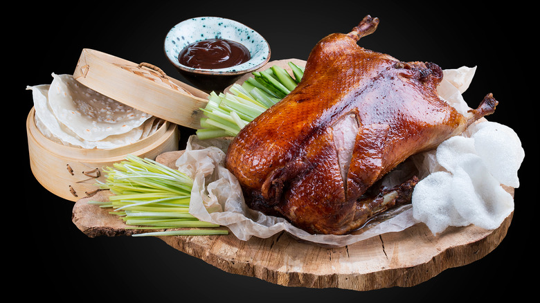 A big part of what makes Peking duck so elaborate is the treatment of the duck's skin. In some other recipes, the fatty skin on the duck breast is scored to release its fat. That would ruin the finished look of Peking duck, however. Expertly preparing Peking duck calls for painstakingly separating the skin from the duck's body in one piece without creating tears. This helps the fatty skin render easily and creates famously crisp skin. Once the skin is loosened, it's seasoned inside and out, and painted with the sugary coating, but another critical step in ensuring the skin is as crisp as possible is similar to a simple trick for crisp chicken skin. That secret is all in letting the skin air dry instead of patting it down to remove moisture.