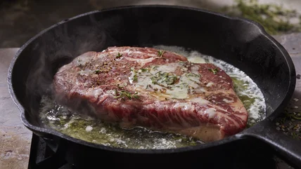 First things first, you need to make sure that you're using the right type of pan to get the temperature just right. Lomonaco said, "I always use a cast iron skillet for maximum heat transfer between the pan and the steak. Preheating the skillet is essential — a minute or two over a medium-high flame should do it." Then, you need to consider the size of the steak. Lomonaco said, "For example, a 1-inch steak may cook to medium rare with 3-4 minutes per side or more but doing a finger check by pressing with your finger on the middle of the steak to check for doneness or even using a digital food thermometer will help you determine the degree of doneness." Additionally, Lomonaco suggested bringing the steak to room temperature before cooking as well as making sure to avoid moving the steak in the pan so that you get a nice sear on the exterior.
