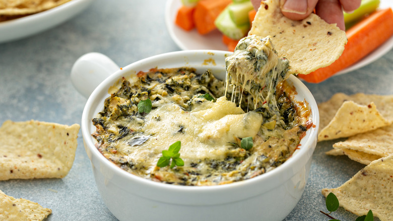 You'll want to stick with a complementary pasta flavor such as white cheddar or four-cheese, as these flavors play well with mozzarella cheese, which is a critical component in the dip. Prepare the dip and the mac and cheese separately before adding the veggies in with the pasta, cheese sauce, and a hefty garnish of mozzarella cheese. The dip base is brimming with garlic and the saltiness from the cheese, plus you'll get a hefty portion of veggies into your meal without having to work too hard. Although fresh dip is best, you can also substitute it with a premade or leftover artichoke dip.