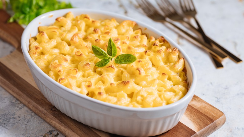 While you will likely get some odd looks if you bring a casserole dish of baked Kraft or Annie's mac and cheese to your next Thanksgiving meal, popping your macaroni and cheese in the oven is an easy way to add extra texture and make your boxed macaroni and cheese taste homemade. After all, who doesn't love mac and cheese that's gooey underneath and slightly crispy on the top?