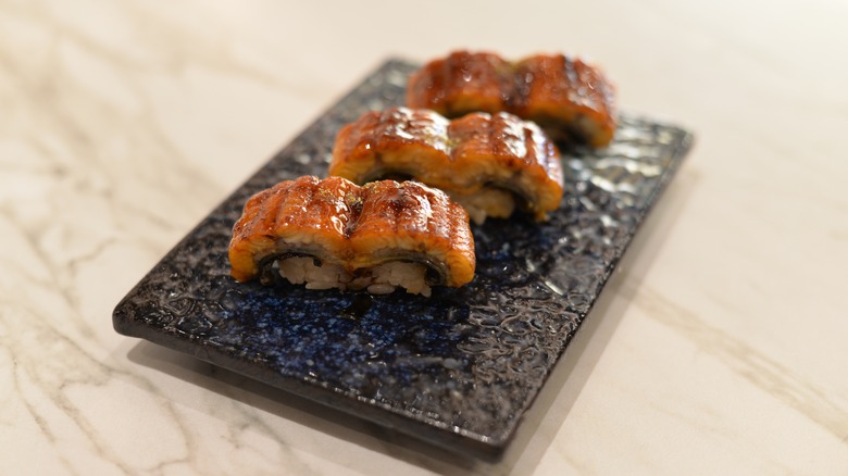 Eel — unagi in Japanese — is most commonly found on sushi menus in the U.S. It's typically grilled and bathed in a sweet sauce of mirin, rice wine, sugar, and soy sauce. The biggest reason for cooking eel, rather than serving it raw like many other types of seafood in sushi, is that one of the eel's natural defense mechanisms is its toxic blood, which becomes safe for consumption when fully cooked.