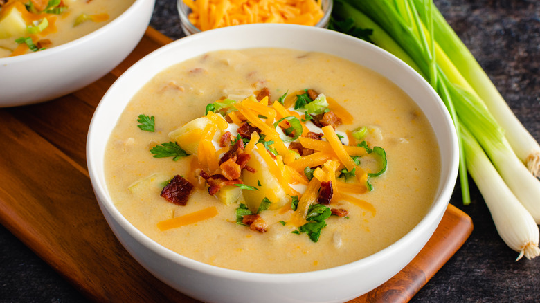 Just as a dollop of sour cream, butter, and grated cheese are typical toppings for a loaded baked potato, adding a splash of cream to potato soup is a no-brainer. Dairy is a delicious and effective tool for thickening and imparting richness to soups. Stirring milk or cream into a pot on the stove tends to happen at the tail end of the cooking process to prevent curdling, however, if you're making potato soup in a slow cooker, evaporated milk is the best option to avoid separation.