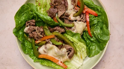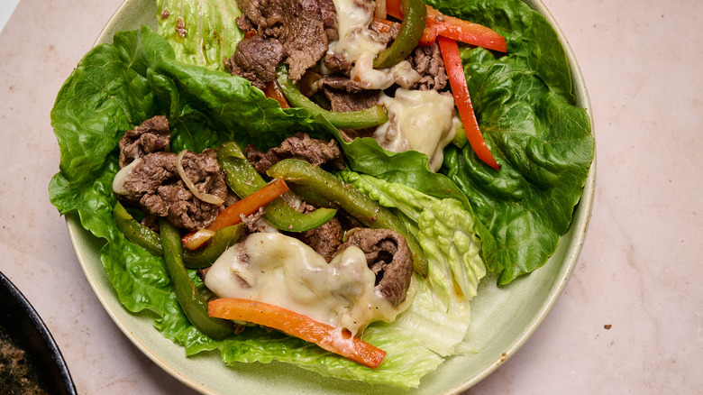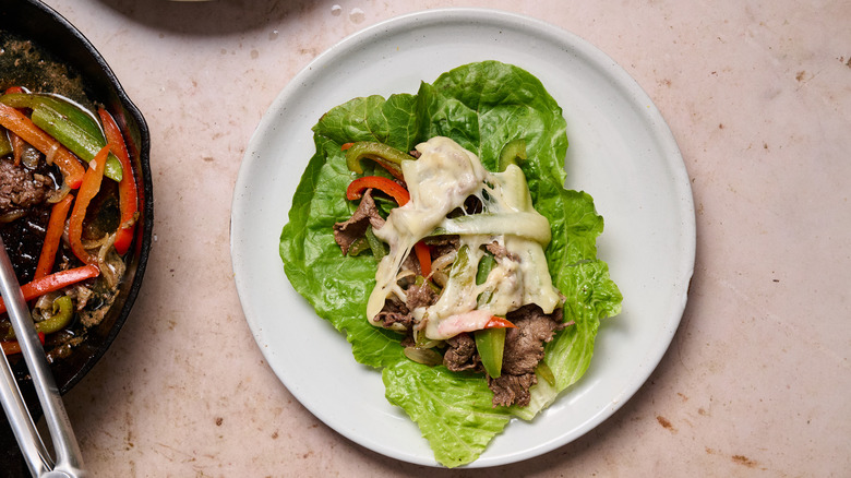 Fresh, crunchy lettuce leaves are the perfect low-carb complement to classic cheesesteak-style beef, sauteed peppers and onions, and melty cheese.