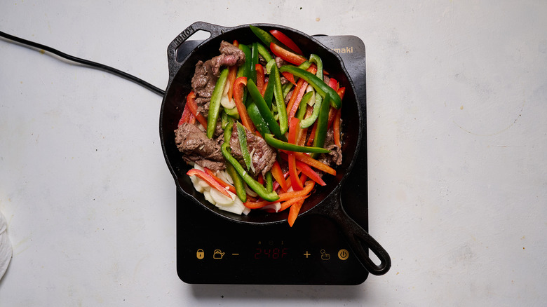 You'll need a few pantry staples like olive oil, salt, and pepper for this recipe. For the meat, you'll need very thinly shaved steak, which you can find premade at many grocery stores or ask the butcher to prepare for you. If you can't get your hands on any, simply slice some steak as thinly as possible at home, or use lean ground beef instead. As for the cut, look for sirloin or ribeye, which are marbled and very tender when quickly cooked.