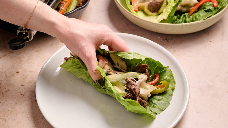 The best part about cheesesteak lettuce wraps is that they can easily be prepped and taken to go for lunches you'll look forward to eating. To do this, cook the filling as normal, melting the cheese on top of the cooked steak, peppers, and onions. Divide the cheesesteak filling into portions and store them in airtight containers in the refrigerator for up to 5 days. To prepare the wraps at your destination, bring along a few lettuce leaves and reheat the beef mixture by microwaving until warm. When you're ready to eat, simply fill the lettuce with filling, and enjoy.