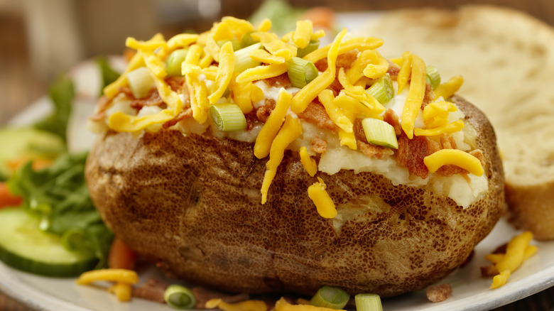 Loading your baked potato up with reckless abandon can actually be somewhat healthier than a plain baked potato. Potatoes are a good source of vitamins and minerals including vitamin C and potassium, and may help lower blood pressure, according to Healthline. However, potatoes are a high glycemic index (GI) food — especially when they're baked — which means they cause a person's blood sugar to spike, making baked potatoes a bit of a hazard for people with diabetes and others trying to regulate their blood sugar levels. One way of reducing the glycemic index of a food is to combine it with protein and fats which slow the digestion of carbs and subsequent rise in blood sugar so stuffing your potato with cheese and butter (within reason) may help to regulate your blood sugar and energy levels.