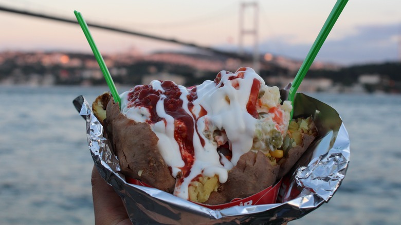 There's nothing wrong with a baked potato topped simply with a generous slap of sour cream and a sprinkling of chives — one mouthful of that creamy goodness can turn a tough day into a great one. But then there's kumpir, the baked potato snack that Turkey adopted. A giant, crispy spud packed to the hilt with all manner of toppings like shredded cheese, butter, sliced sujuk Turkish sausage, vegetables and spicy sauce, it's the baked potato equivalent of everything and the kitchen sink, in the best way. There's a time and a place for culinary minimalism but it isn't anywhere near your baked potato, and taste is only one of the reasons why.