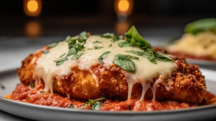 Another great tip to maximize the crispy texture of chicken parmesan is to cook your breaded chicken separately from the marinara and combine both elements just before serving. This technique allows the coating to remain crisp because the sauce doesn't soak through the crust and turn it soggy while it cooks. Simply dredge your protein in your pre-toasted panko and bake in the oven until the chicken is cooked, glide over a portion of hot marina and melty cheese, and dig into a dish with an uber-crackly, high-flavored crust.