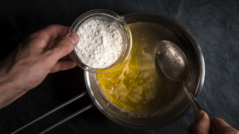 Once the butter is fully melted, it might be tempting to dump all of the flour into the pan at once. You can make a béchamel sauce this way, but adding the flour slowly makes it easier to keep your sauce smooth and lump-free. Adding the flour slowly is most effective when you're making a large batch of béchamel with more flour, but even when you're only adding a few tablespoons of flour, sprinkling it in a little at a time is an easy way to keep your sauce smooth as silk.