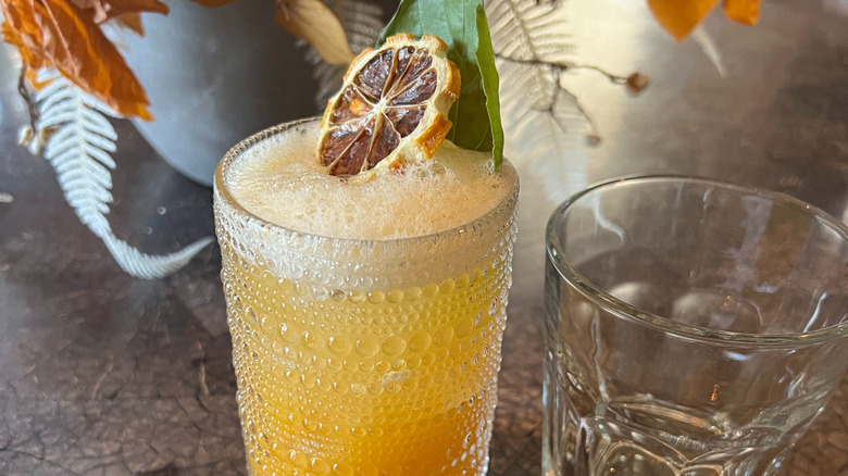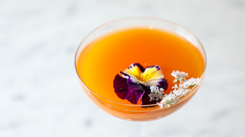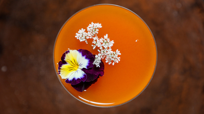 Indeed, the vibrant drink is a juicy blend of peach, orange oleo, N/A light beer, and Seedlip Grove 42, a non-alcoholic spirit with notes of orange, lemon peel, lemongrass, and ginger. It's topped with edible flowers for a fanciful garnish.