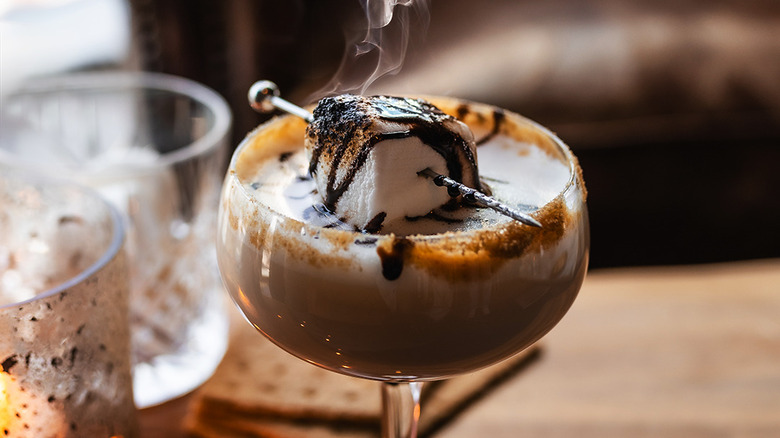 The Give Me S'More makes an ideal nightcap. It's a fun winter sipper featuring marshmallow syrup, oat milk, chocolate, brown sugar graham cracker rim, and toasted marshmallow.