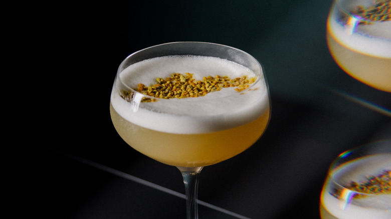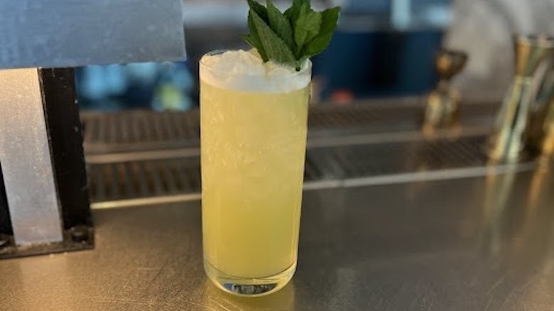 Steeped in spices and herbs, the puckery potable features turmeric, pineapple, and ginger tonic poured together with basil lemonade. The whole thing is as quenching and crisp as it sounds, and it tastes as sunny as it looks.