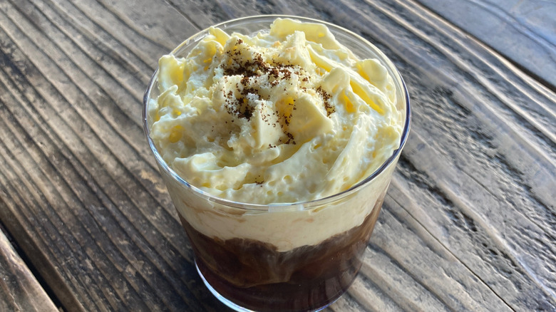 The multi-layered drink features all the tiramisu requisites: mascarpone, vanilla syrup, cream, biscotti crumble, espresso powder, cold brew, and coffee ice. Bitter and sweet, the tiramisu cream is a blend of mascarpone, heavy cream, and vanilla, layered over a double shot of espresso and cold-brew coffee.