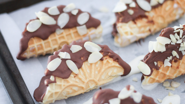 For a fun and portable way dessert, try these ice cream taco sandwiches. Make pizzelle sugar cookies with an iron and carefully mold them into taco-like shapes. Fill them with vanilla ice cream drizzled with caramel sauce, then dunk half the taco into melted chocolate to create a shell. Next, garnish them with crushed almonds or other goodies like shredded coconut or mini chocolate chips. You'll be hard-pressed to resist one of these.