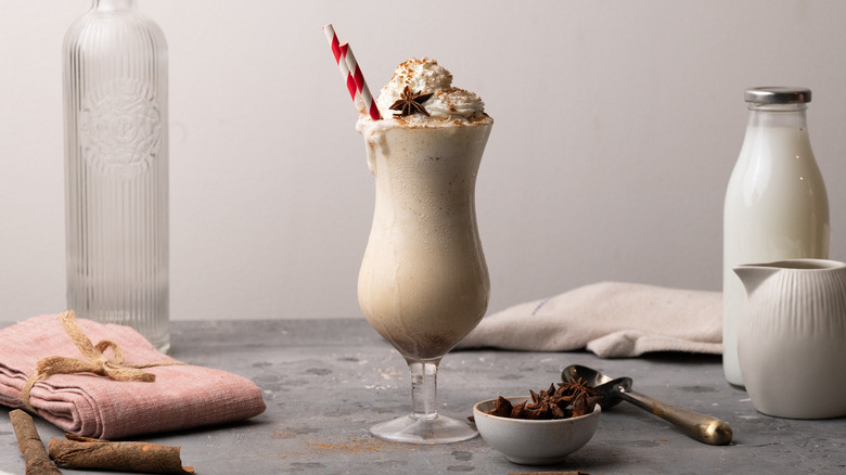 Any recipe that offers a new way to consume eggnog gets bonus points from us. This easy milkshake features vanilla ice cream, eggnog, cinnamon, and nutmeg. Just blend the ingredients and serve with a dollop of whipped cream and an extra dusting of nutmeg. A cinnamon stick transforms this rich treat from a flavored milkshake to an elevated dessert, worthy of holiday hosting or anytime you're in the mood for a sweet and spiced drink.