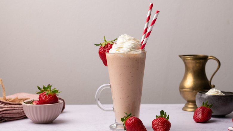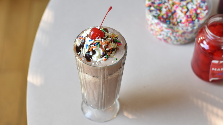 Every dessert lover needs a chocolate milkshake recipe in their back pocket, and this one fits the bill. Whip heavy cream, vanilla, and sugar, then combine it in a blender with chocolate ice cream and milk. Pour the thick liquid into a tall glass and garnish it with all your favorite treats. Don't skip the whipped cream or chocolate sauce, and add rainbow sprinkles for a splash of fun and crunch. Try crushed salted peanuts to contrast the sweetness, and don't forget to finish it off with a maraschino cherry on top.