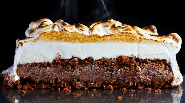 S'mores checks all the right boxes when it comes to a delicious dessert, and this ice cream cake variation amplifies those flavors further. Go all out by making your own graham crackers or buy them premade. Then, combine them with chocolate and melted butter for the crust. Top it with a layer of chocolate ice cream, a sprinkling of chocolatey graham crackers, and a layer of vanilla ice cream. Finish it off with a torched marshmallow topping for a deluxe cake that will appeal to your sugary desires.