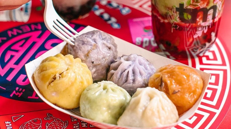 The bottom floor also has prepared food vendors, like Mao's Bao for boiled dumplings and the iconic sheng jian baos, a pan-fried bun stuffed with fillings like pork, beef, chicken, lamb, and Impossible meat. Kimbap Lab serves up a modern take on the Korean classic with seasoned rice, vegetables, and fillings like bulgogi beef, spicy pork, chicken, or tofu skins rolled in dried seaweed. Finally, the Little Eats snack bar hosts a rotating selection of Asian vendors. During winter, the award-winning Laksa Shop has been known to serve up Southeast Asian noodle soups to warm up guests. For traditional and unique bubble teas and coffees to pair with your food, stop by Tea and Milk.